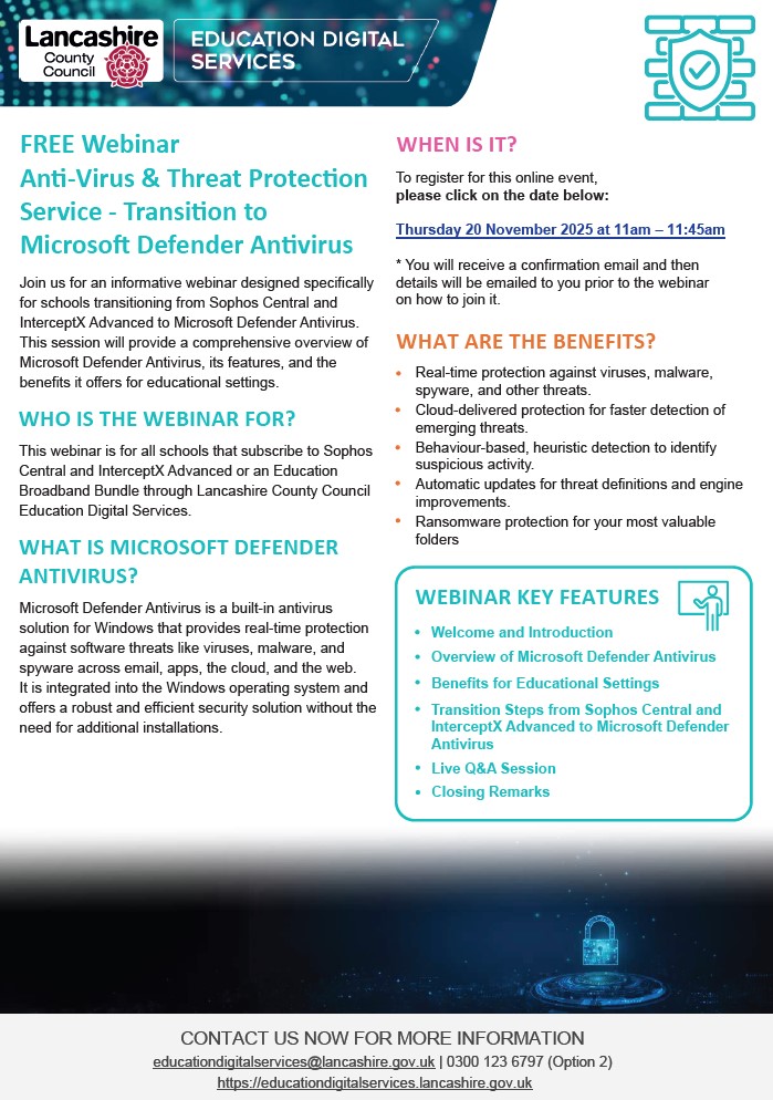 As part of our commitment to improving cybersecurity across Lancashire schools, Lancashire County Council Education Digital Services is announcing a planned transition from Sophos Central and Intercept X to Microsoft Defender Antivirus.