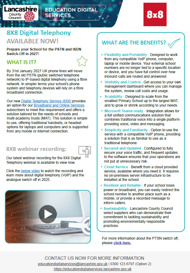 Our new Digital Telephony Service (8X8) provides an option for our Broadband and Online Services subscribers to meet this requirement and offers a solution tailored for the needs of schools and multi-academy trusts (MAT). This solution is simple to use, offering traditional handsets, or headset options for laptops and computers and is supported from any mobile or internet connection.