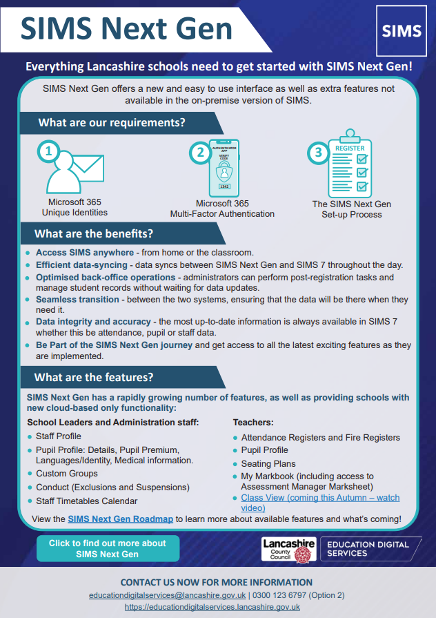 If your school is interested in adding SIMS Next Gen to your SIMS MIS please contact us at EducationDigitalServices@Lancashire.gov.uk.